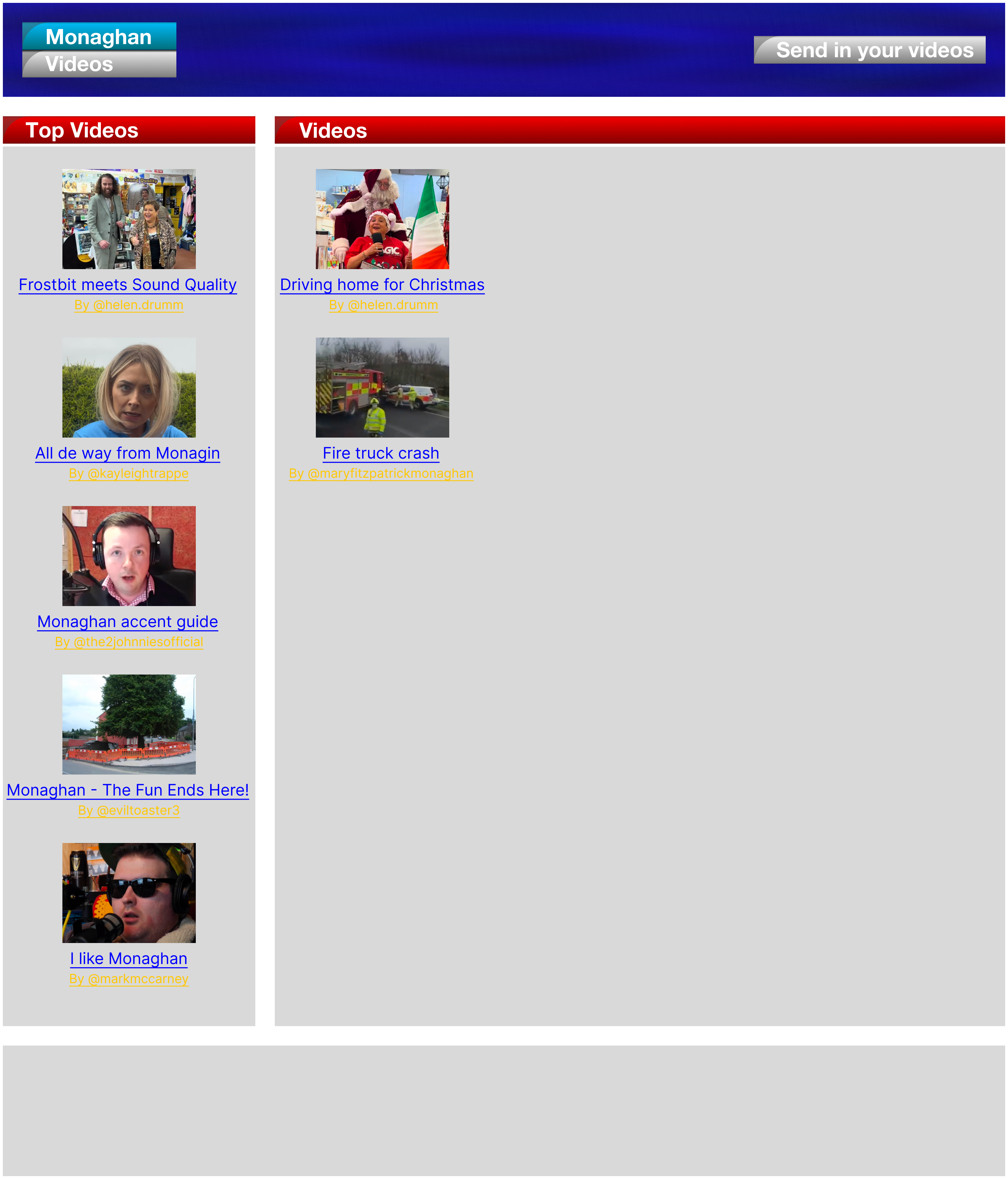 Monaghan Videos Send in your videos Frostbit meets Sound Quality All de way from Monagin Monaghan accent guide with Oliver Callan Monaghan - The Fun Ends Here! I like Monaghan Driving home for Christmas with Helen! Fire truck crash